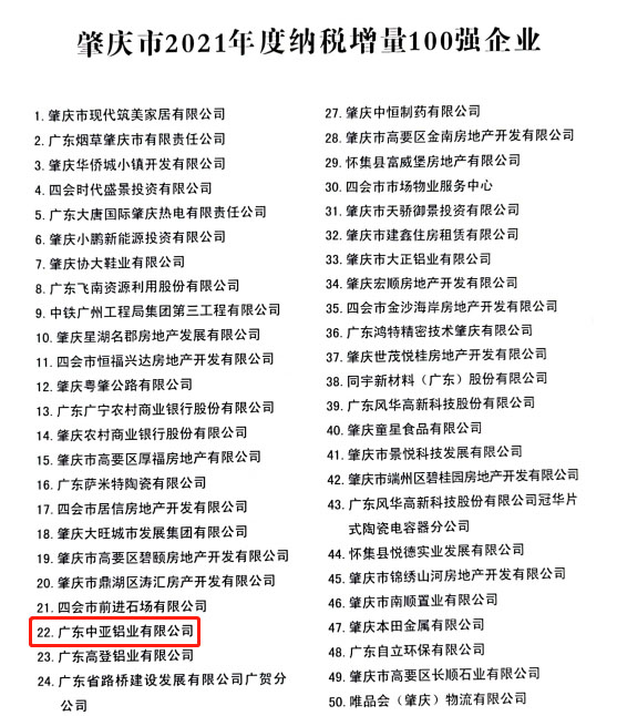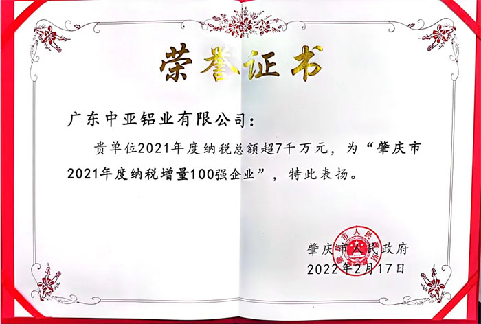 廣東中亞鋁業獲2021納稅100強企業榮耀