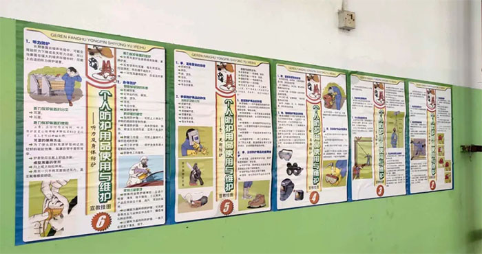 此外,我司在車間、飯堂與生活區張貼海報、橫幅,時刻向全體員工宣教安全知識,利用LED屏幕與多媒體投屏滾動播放安全守則、放映視頻動畫,增強全體員工的安全防范意識。